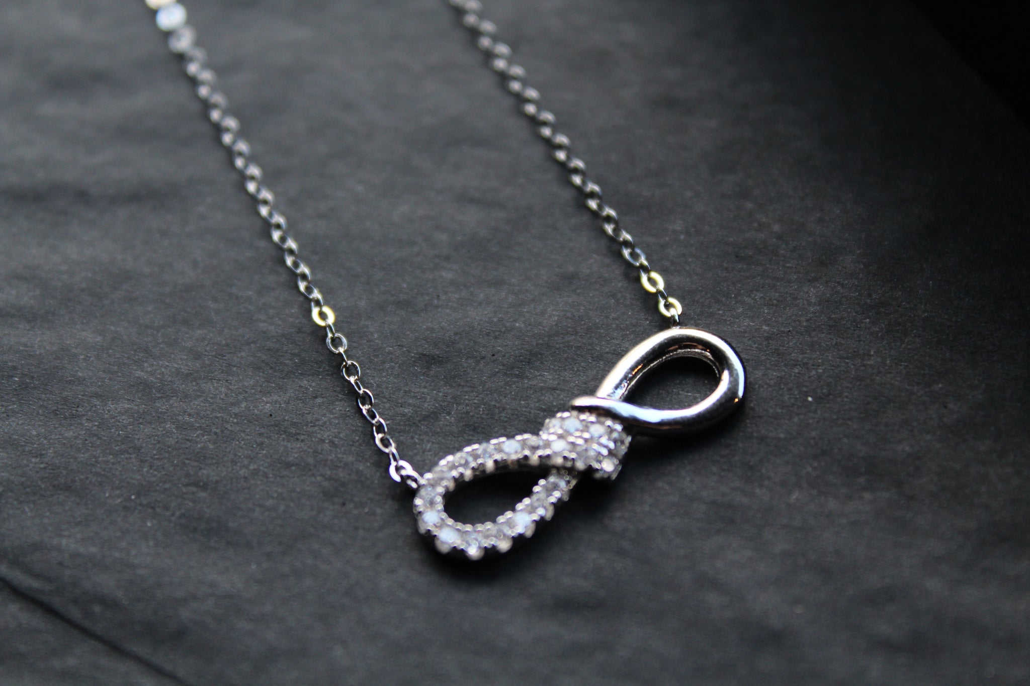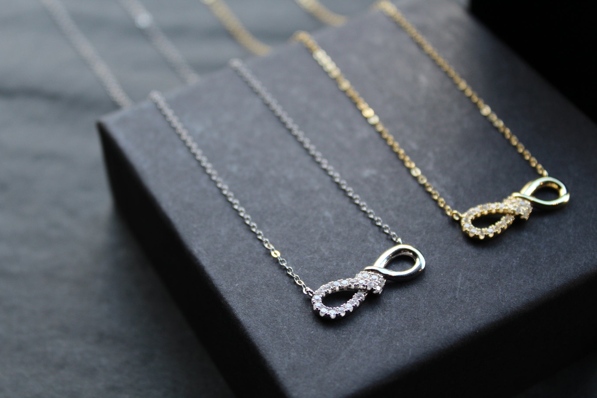 41-46cm rhodium or gold plated Sterling Silver trace chain infinity necklace features a captivating design with a half-plain, half-cubic zirconia embellishment, symbolizing balance and eternal elegance.