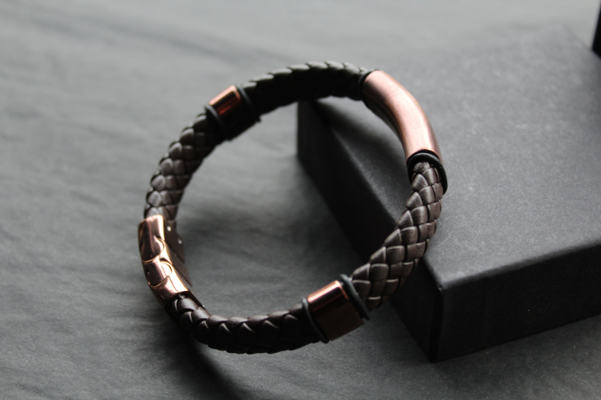 Crafted with precise attention to detail, this bracelet combines the richness of genuine leather with the strength and sophistication of coffee plated stainless steel sections. Whether worn casually or as a statement piece, this bracelet exudes confidence and charisma, embracing the best of classic style whilst being unafraid to stand out.