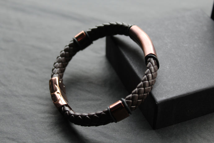 Fred Bennett Woven Brown Leather Bracelet with Coffee Plated Stainless Steel