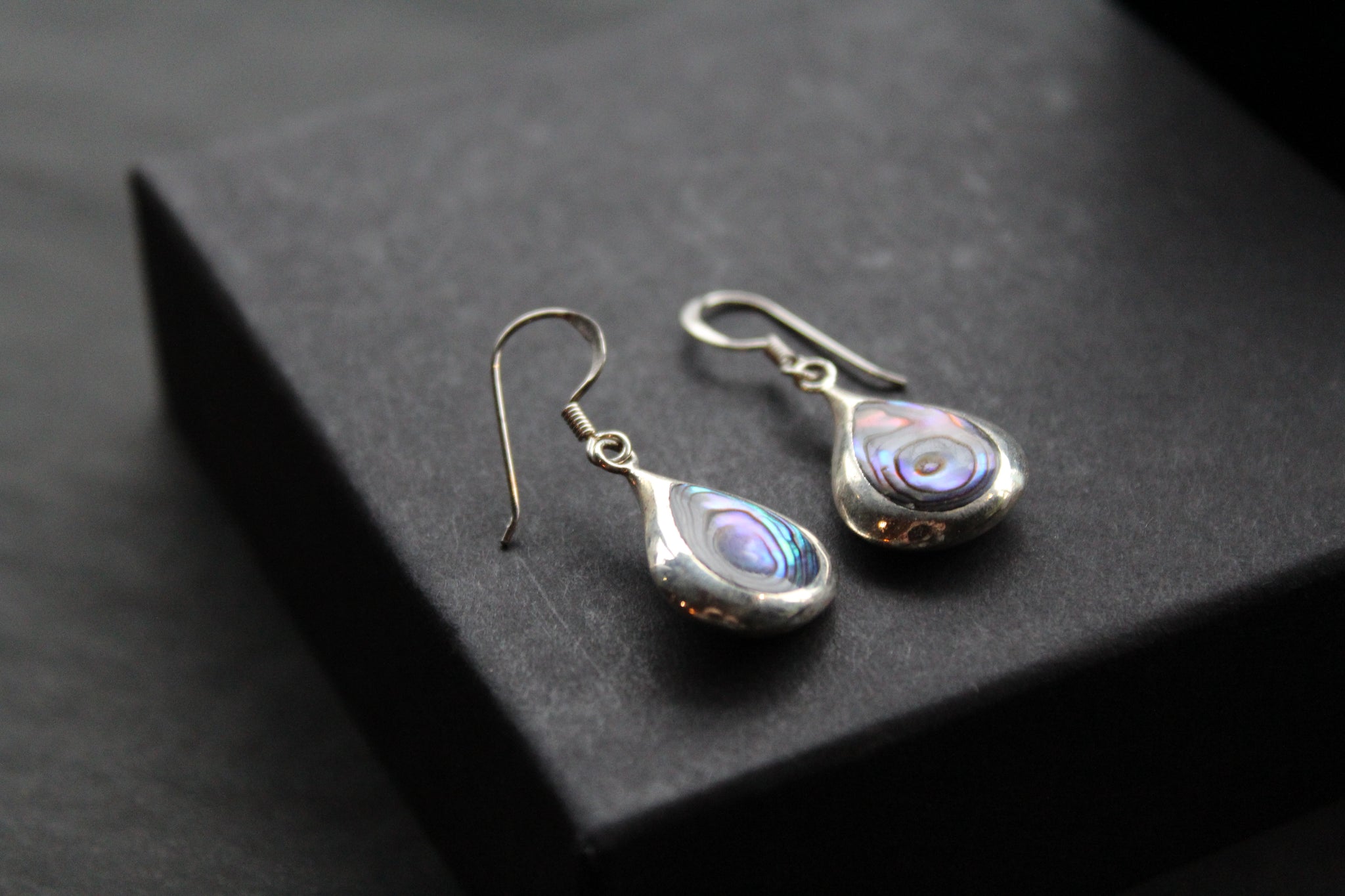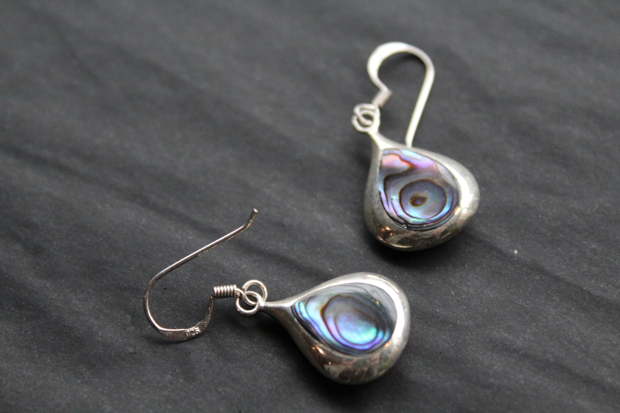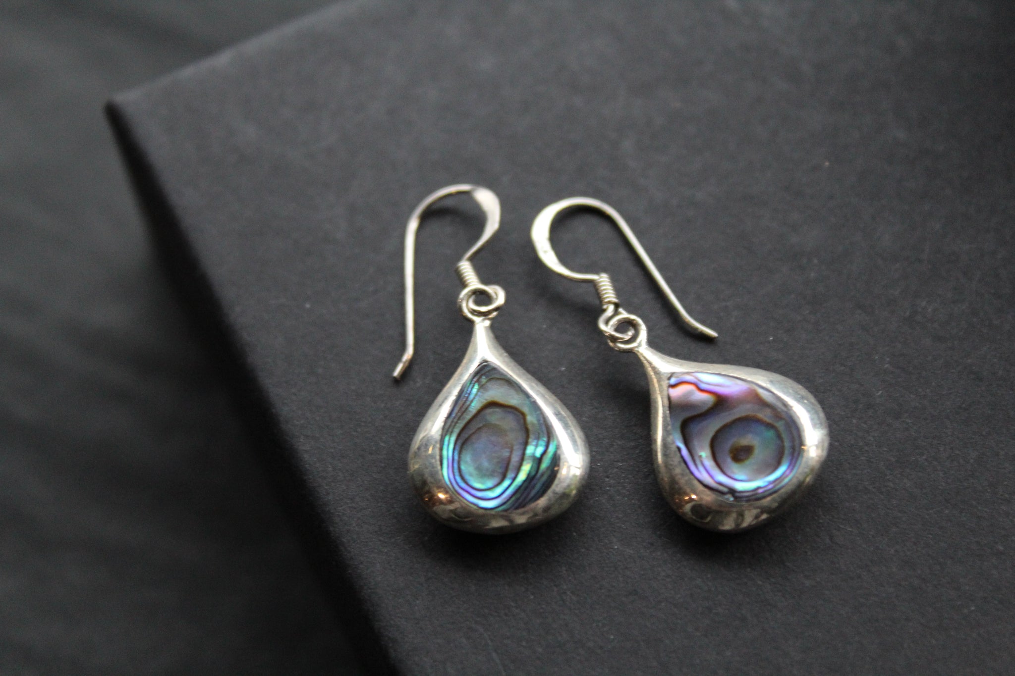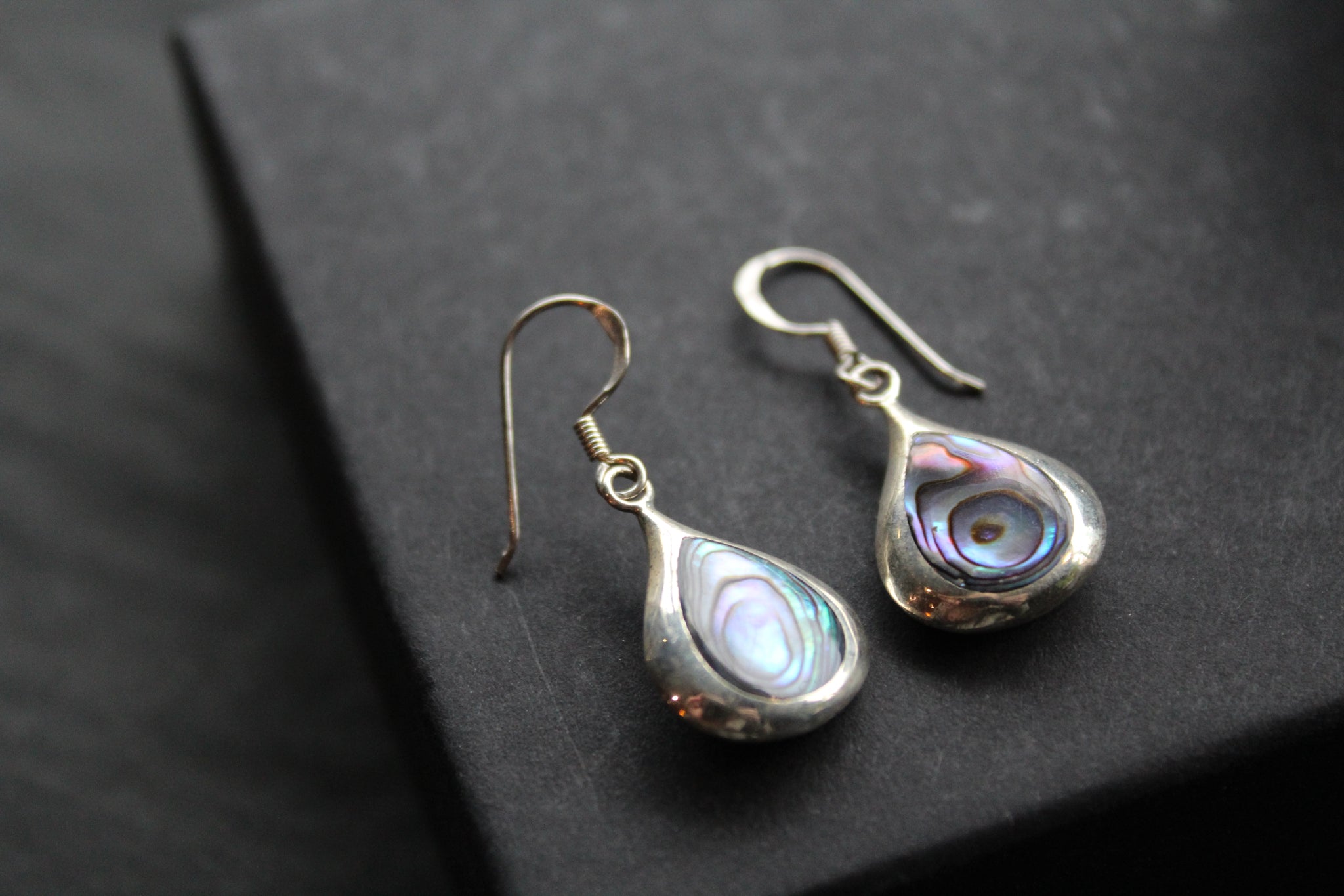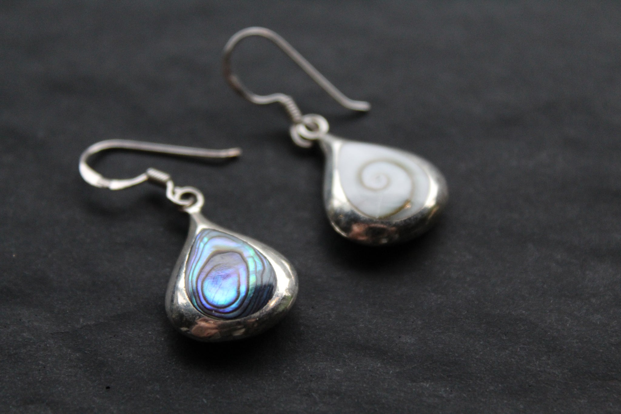 These stunning teardrop shaped earrings feature the beautiful green and blue shades of abalone shell on the front with a swirl of shiva's eye on the reverse.