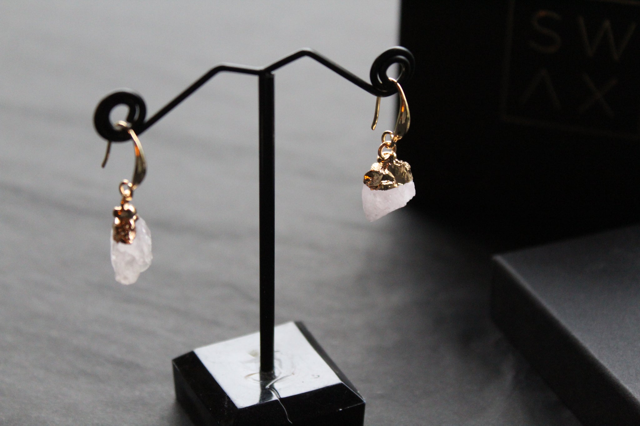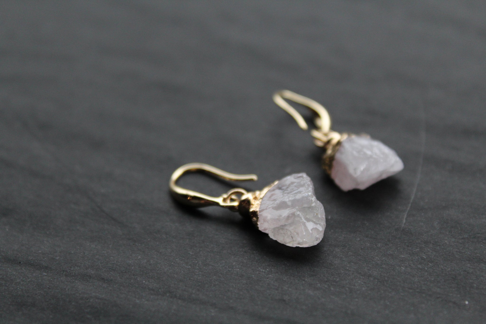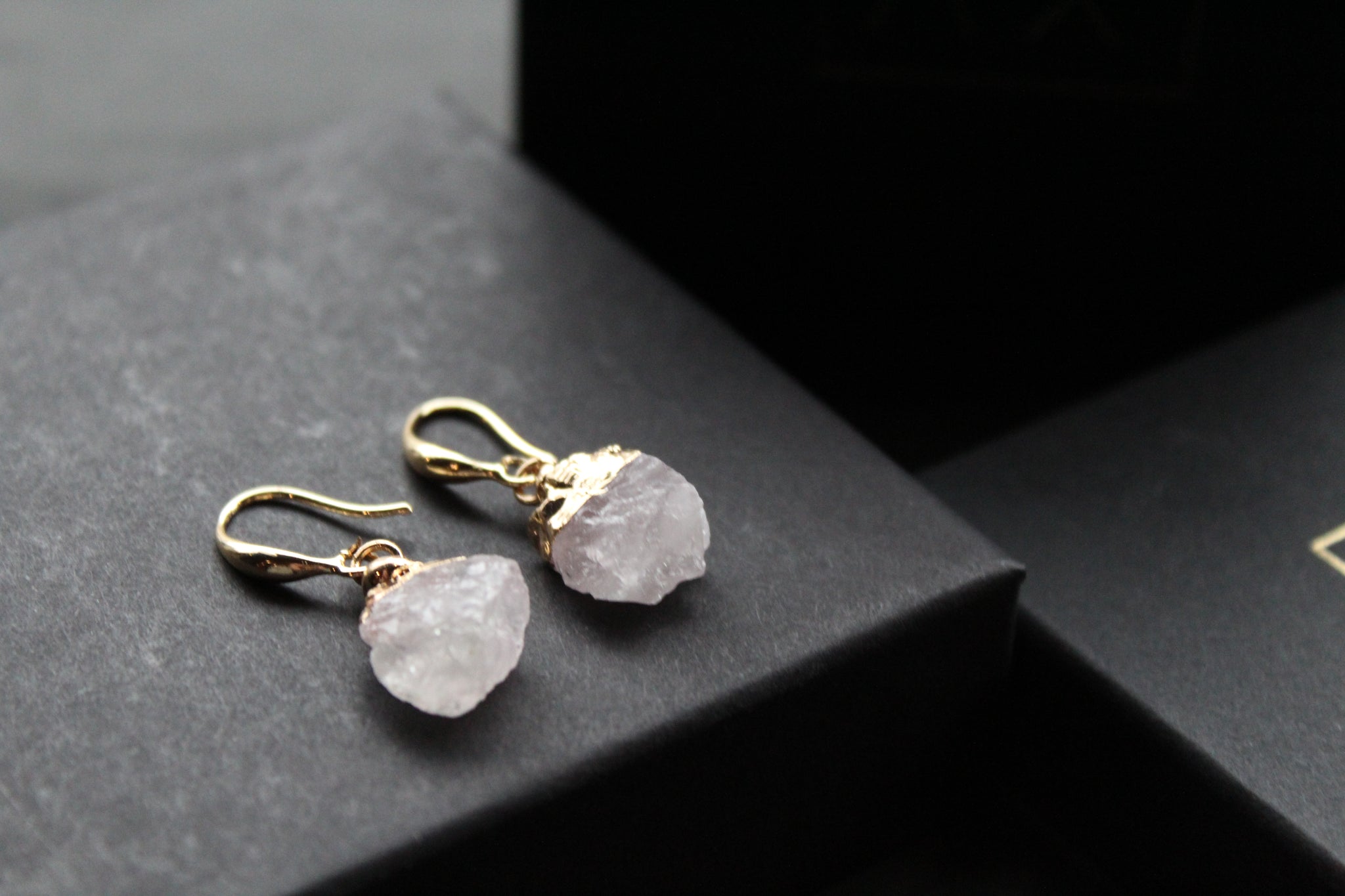 Designed in Portugal and handmade in small batches, these gorgeous drop earrings feature raw cut semi-precious Rose Quartz crystals with a gold tone plate and hook.
