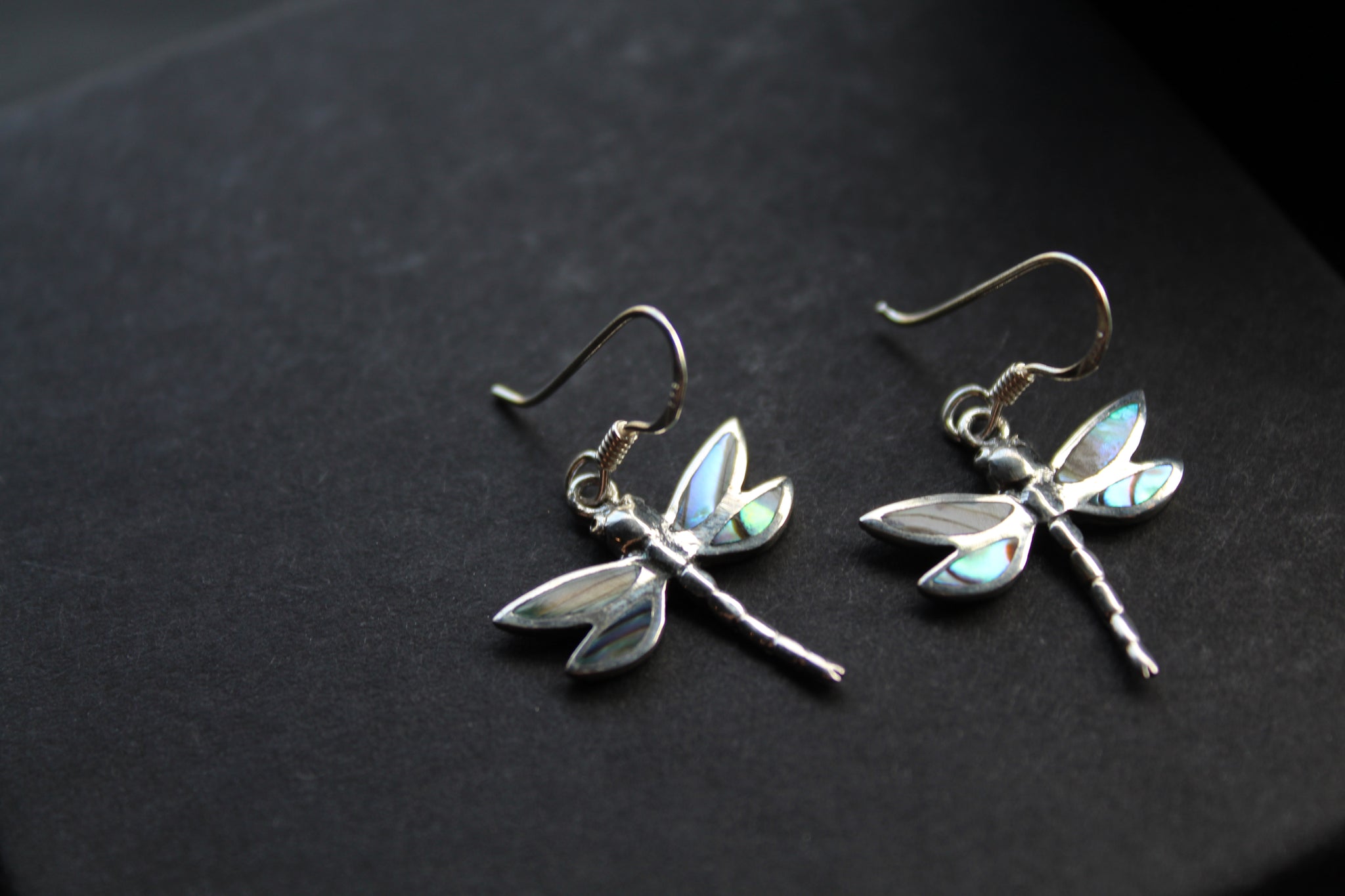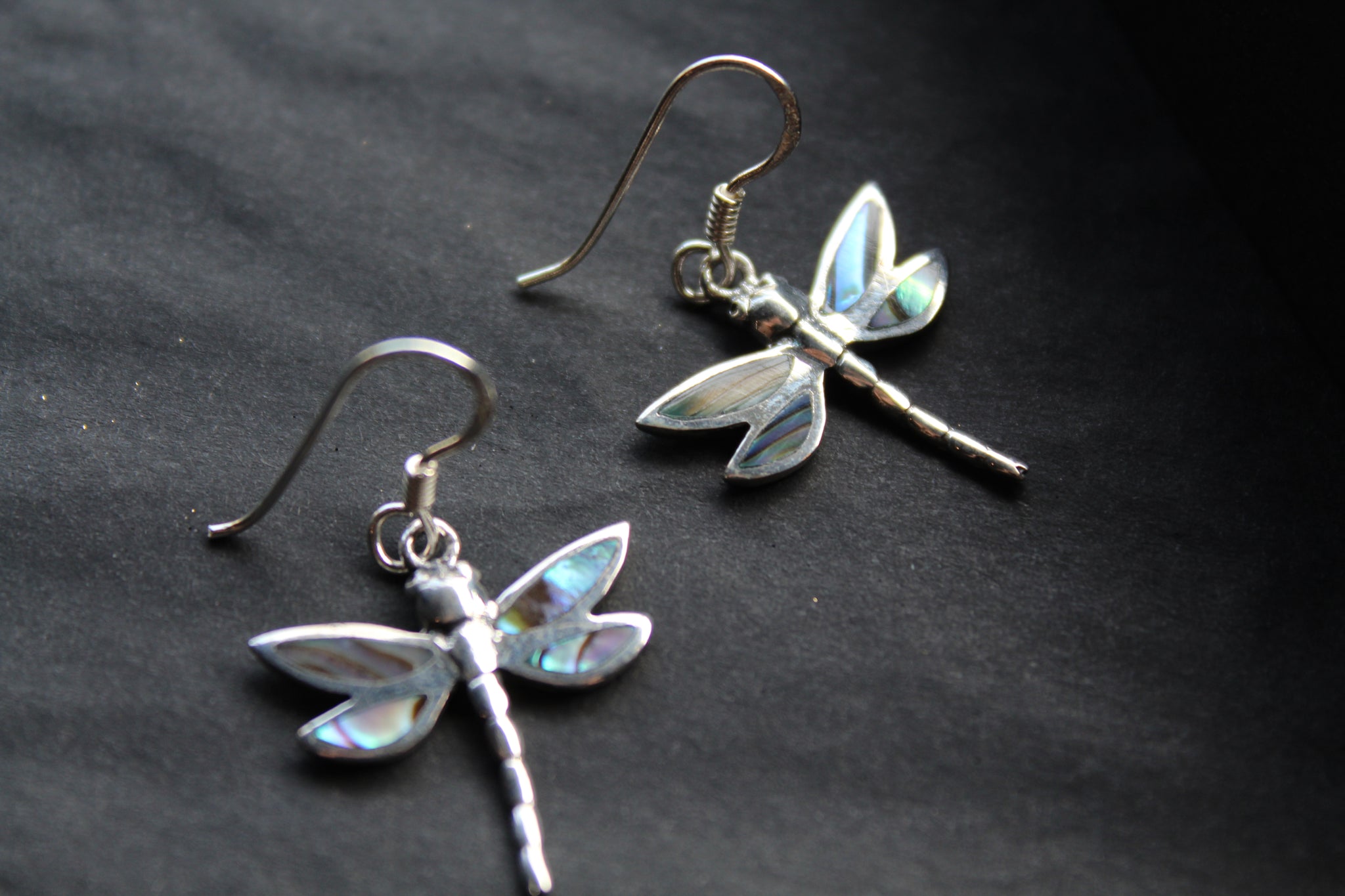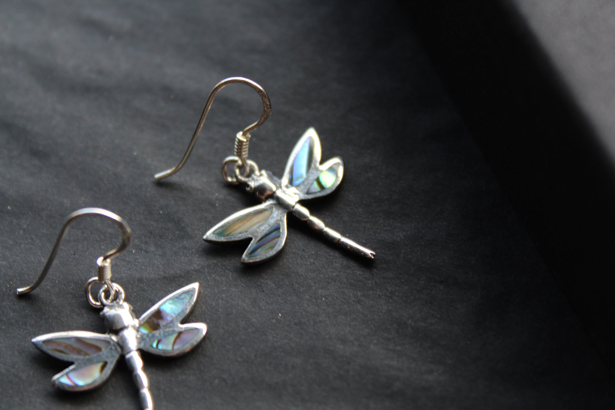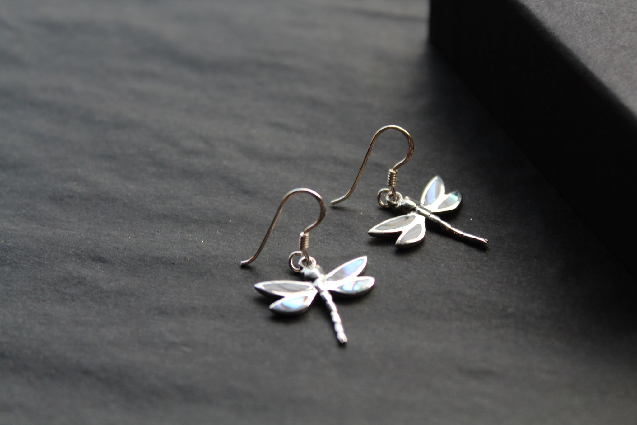Stunning silver dragonfly drop earrings with inset abalone on the wings.