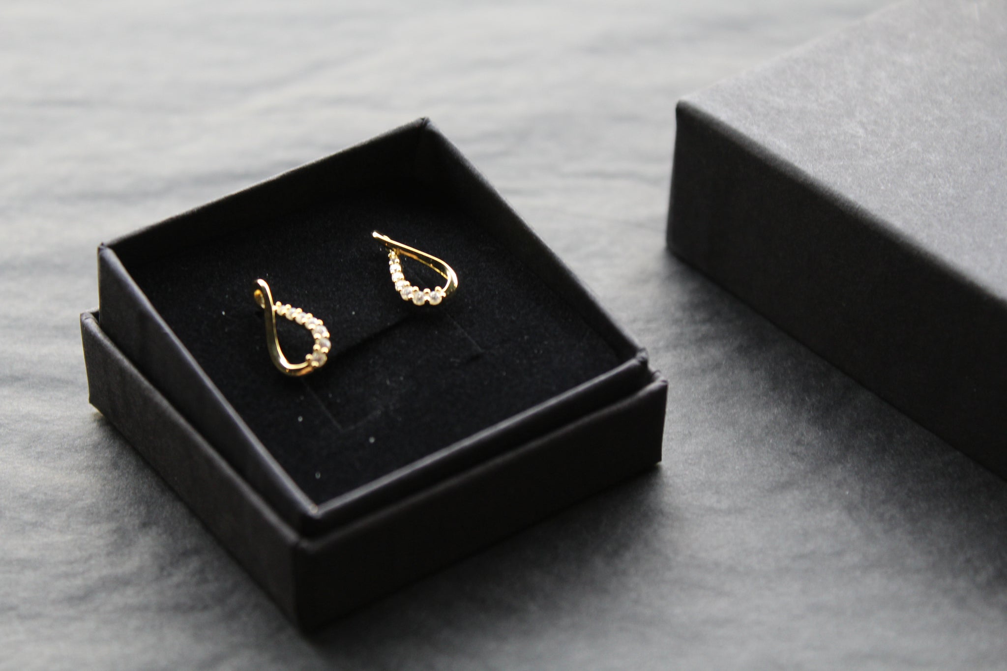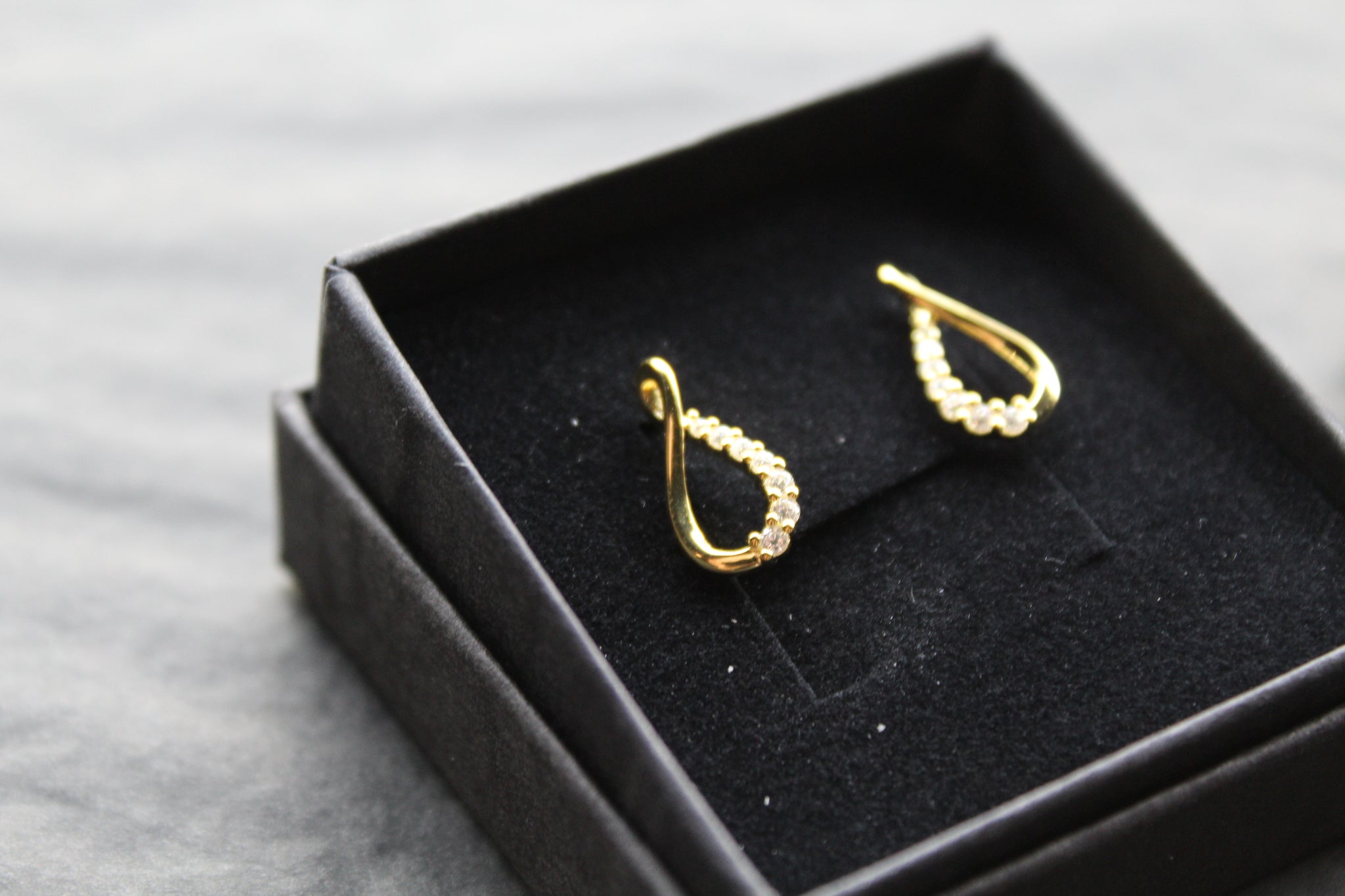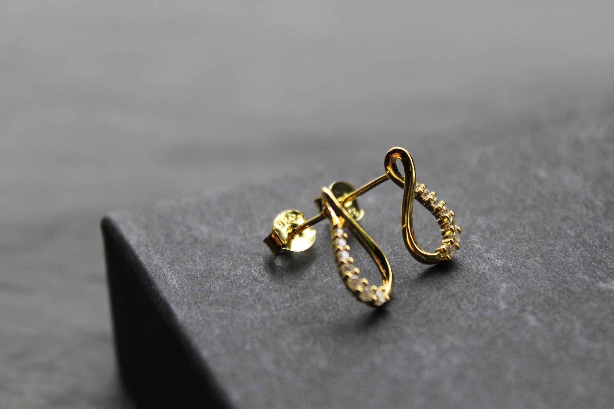 Refined and lightweight Infinity shape stud earrings in yellow gold plated sterling silver, featuring a fluid twist design with one side set in sparkling cubic zirconia.