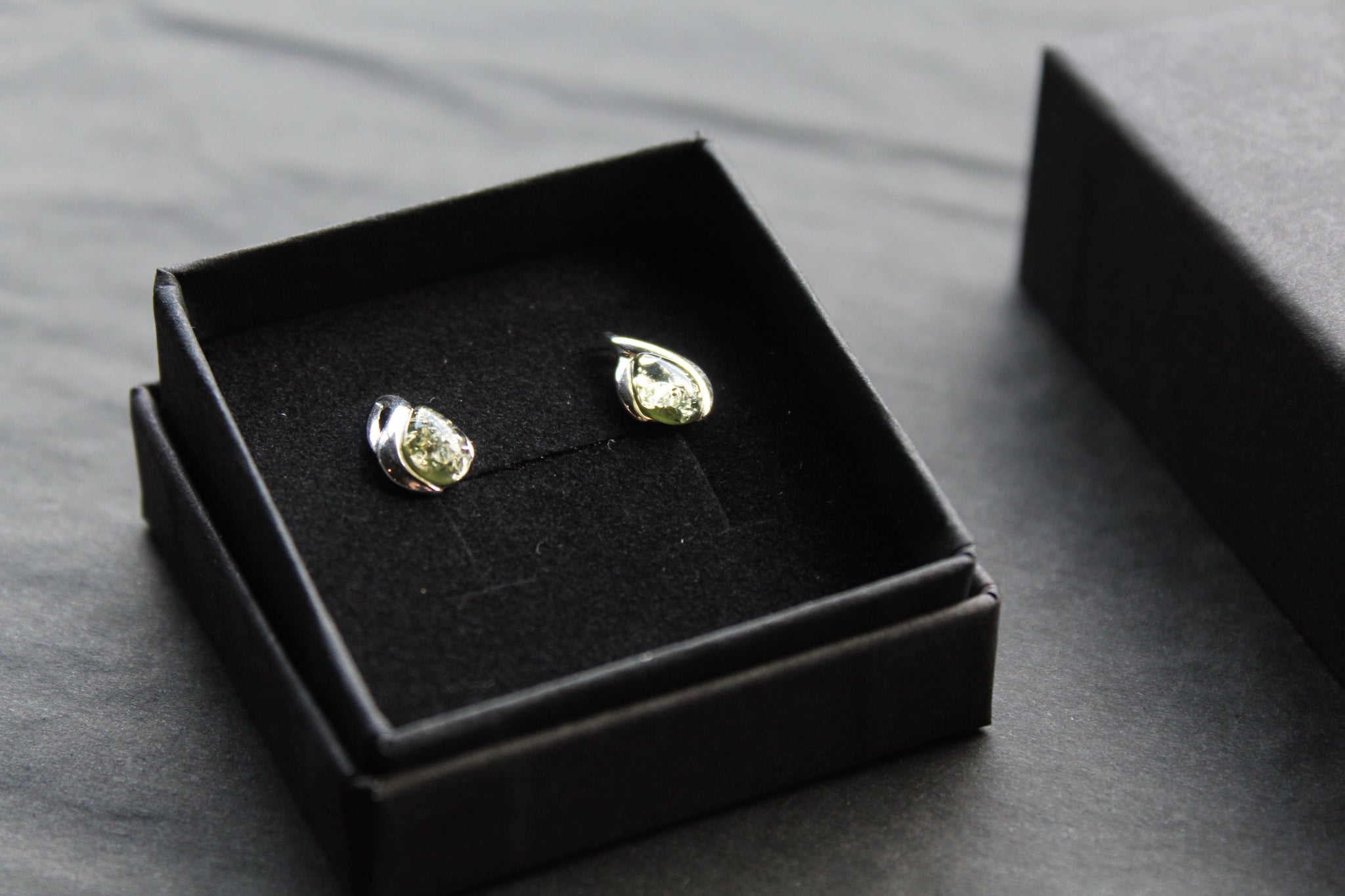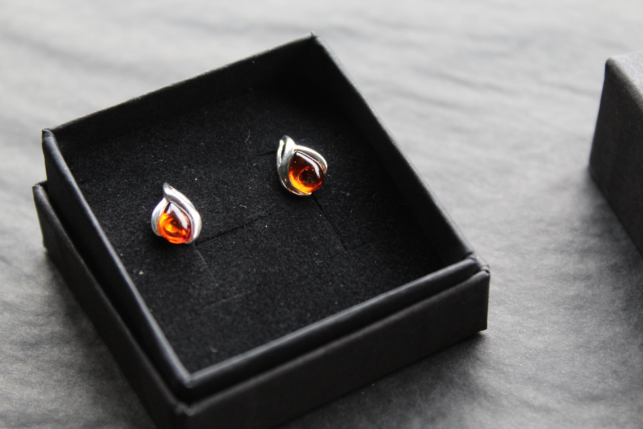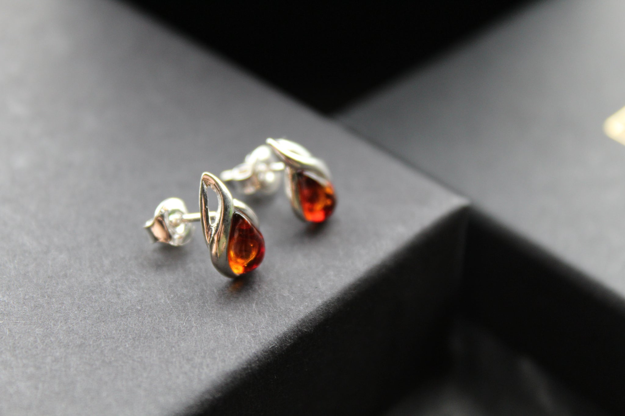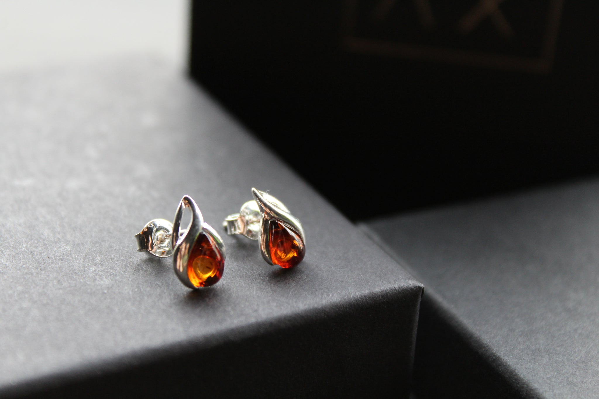 These gorgeous teardrop stud earrings are made in sterling silver and come in either Cognac Amber or Green Amber.