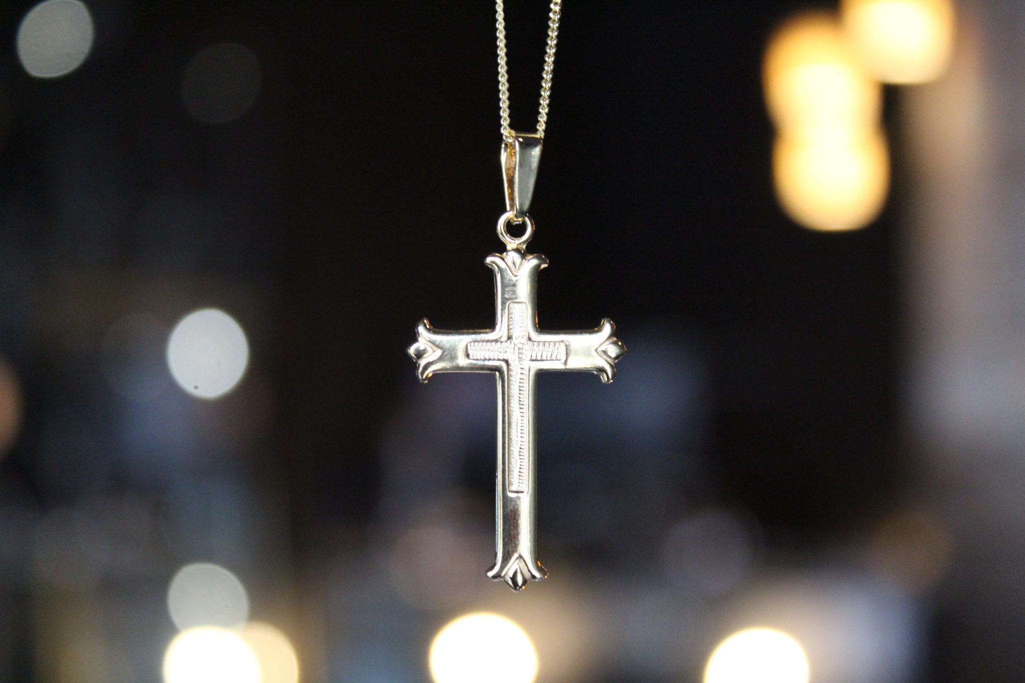 The centre features a subtle engraved cross, adding dimension and depth to the piece.