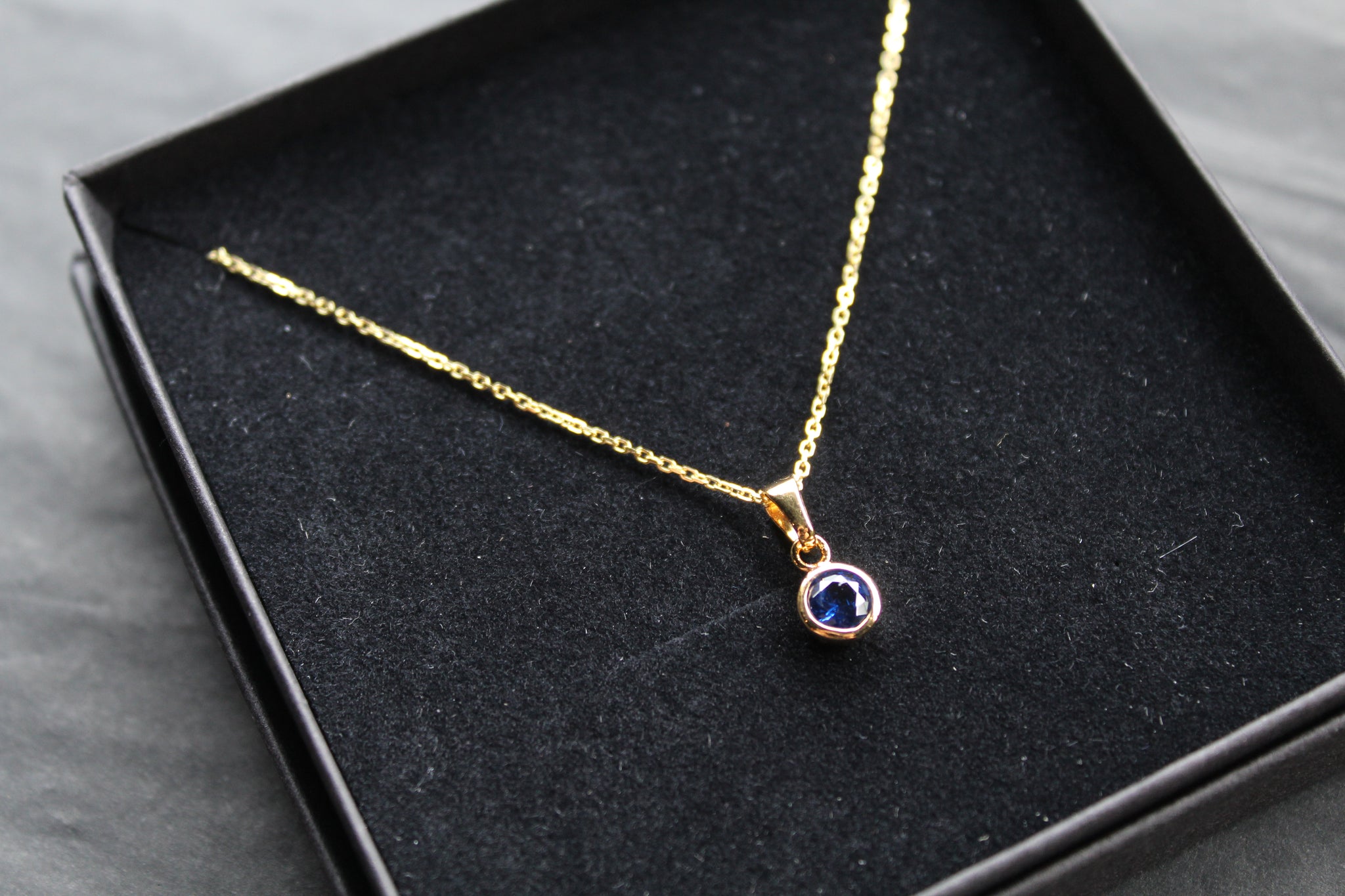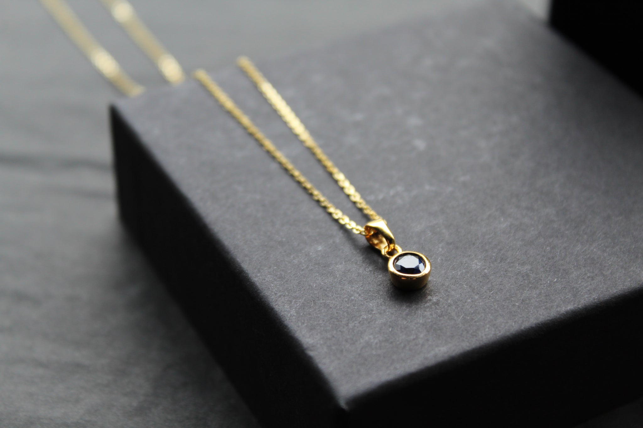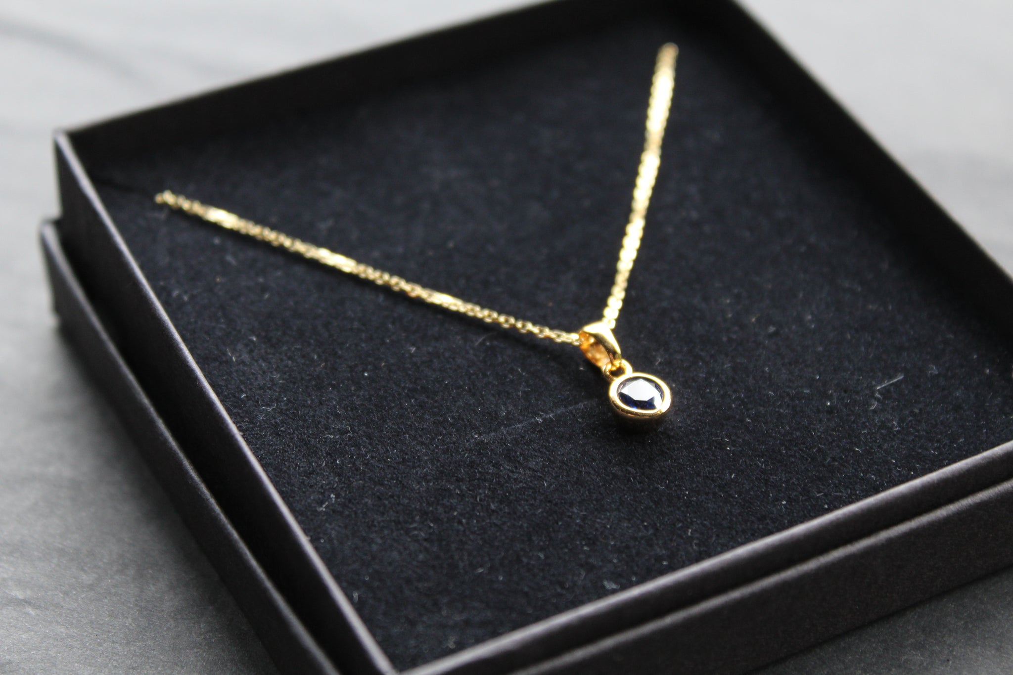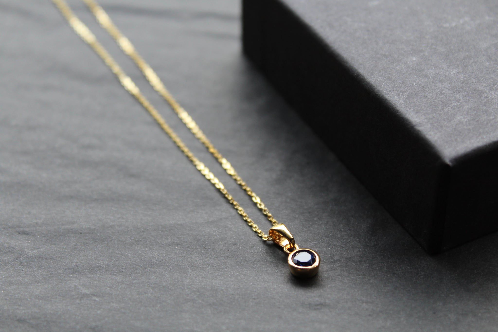 Gold-plated rub-over cubic zirconia September birthstone pendant on 18" Gold-plated Chain.