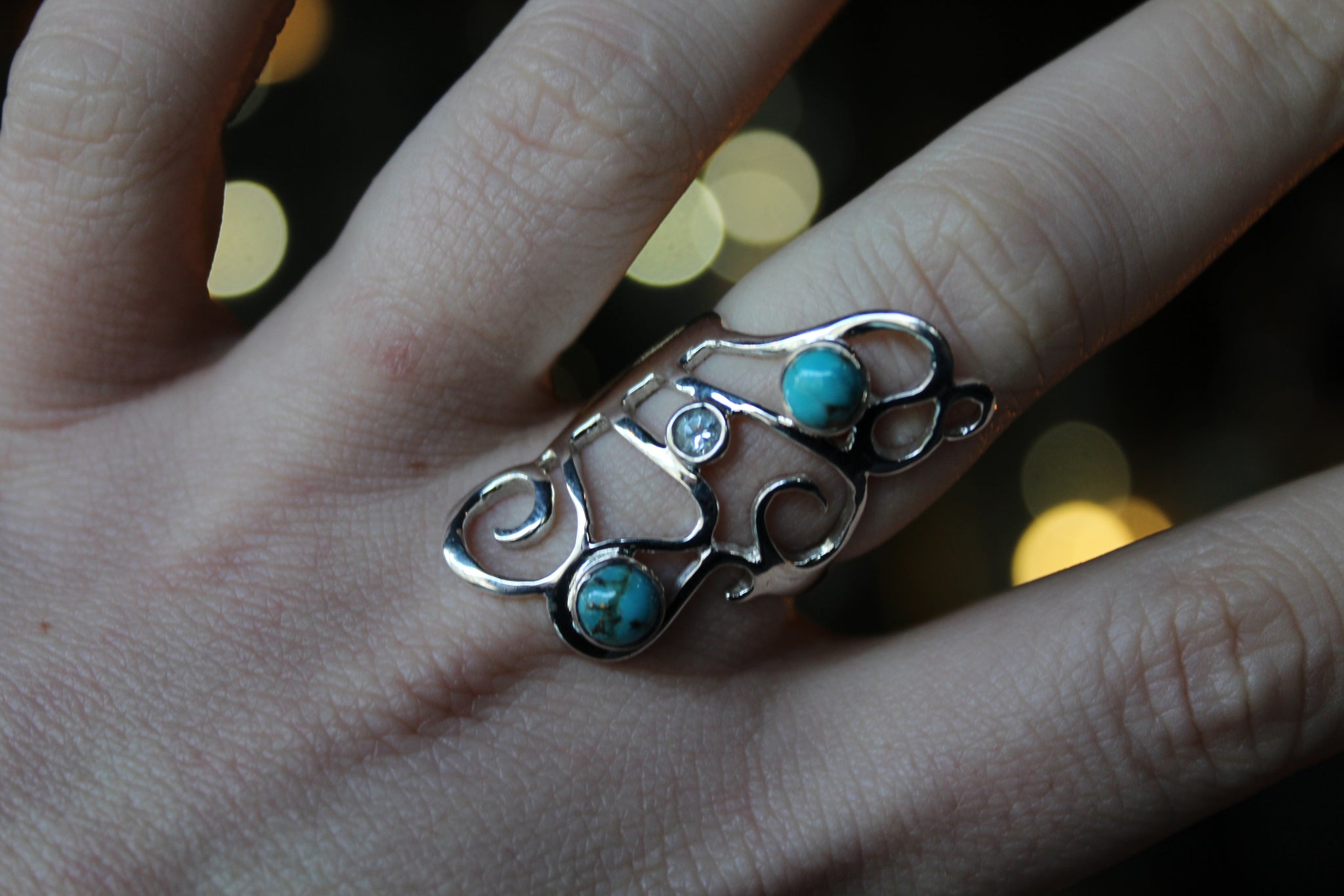 Three stone blue Mohave and blue topaz swirly long silver ring