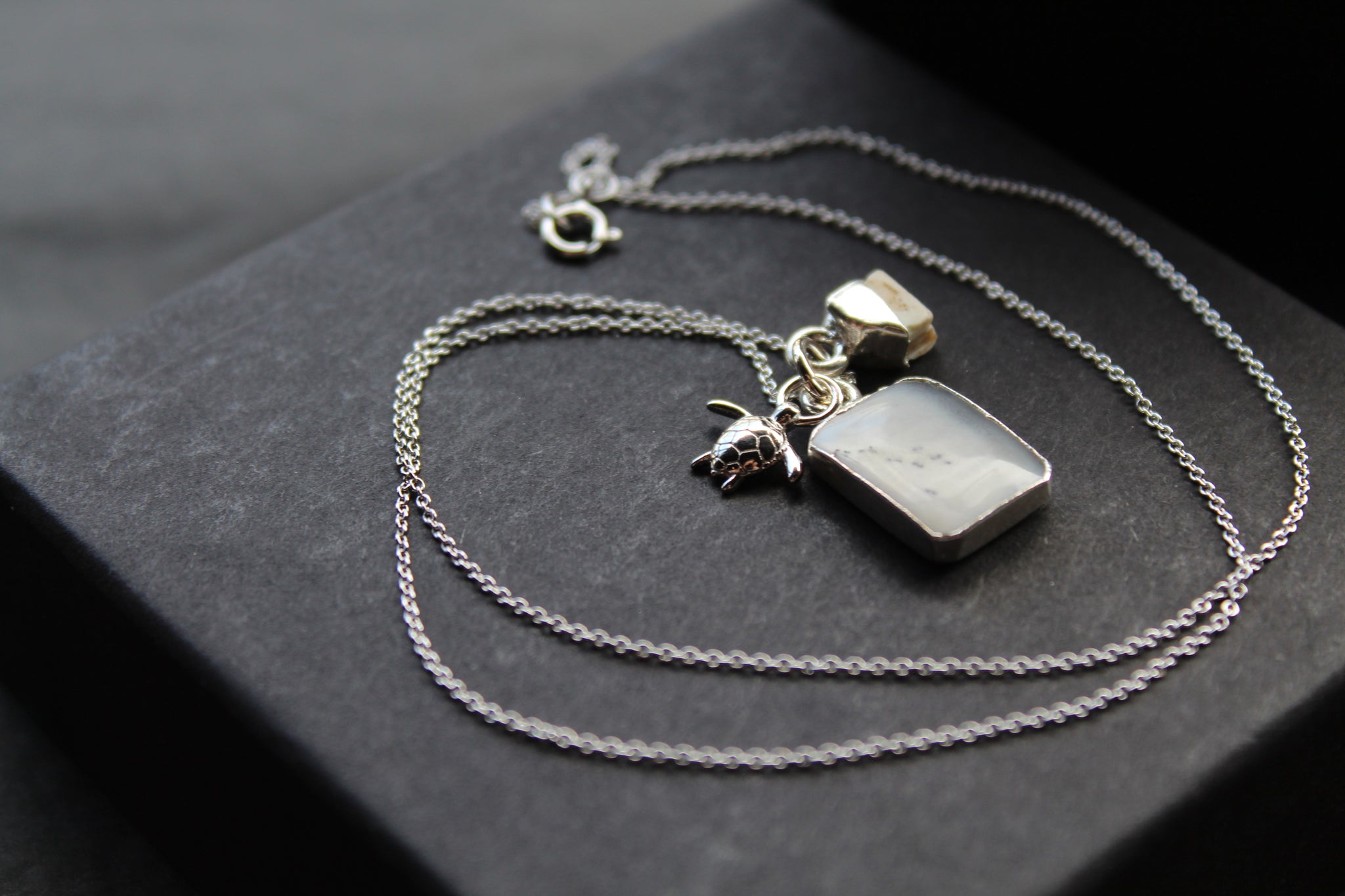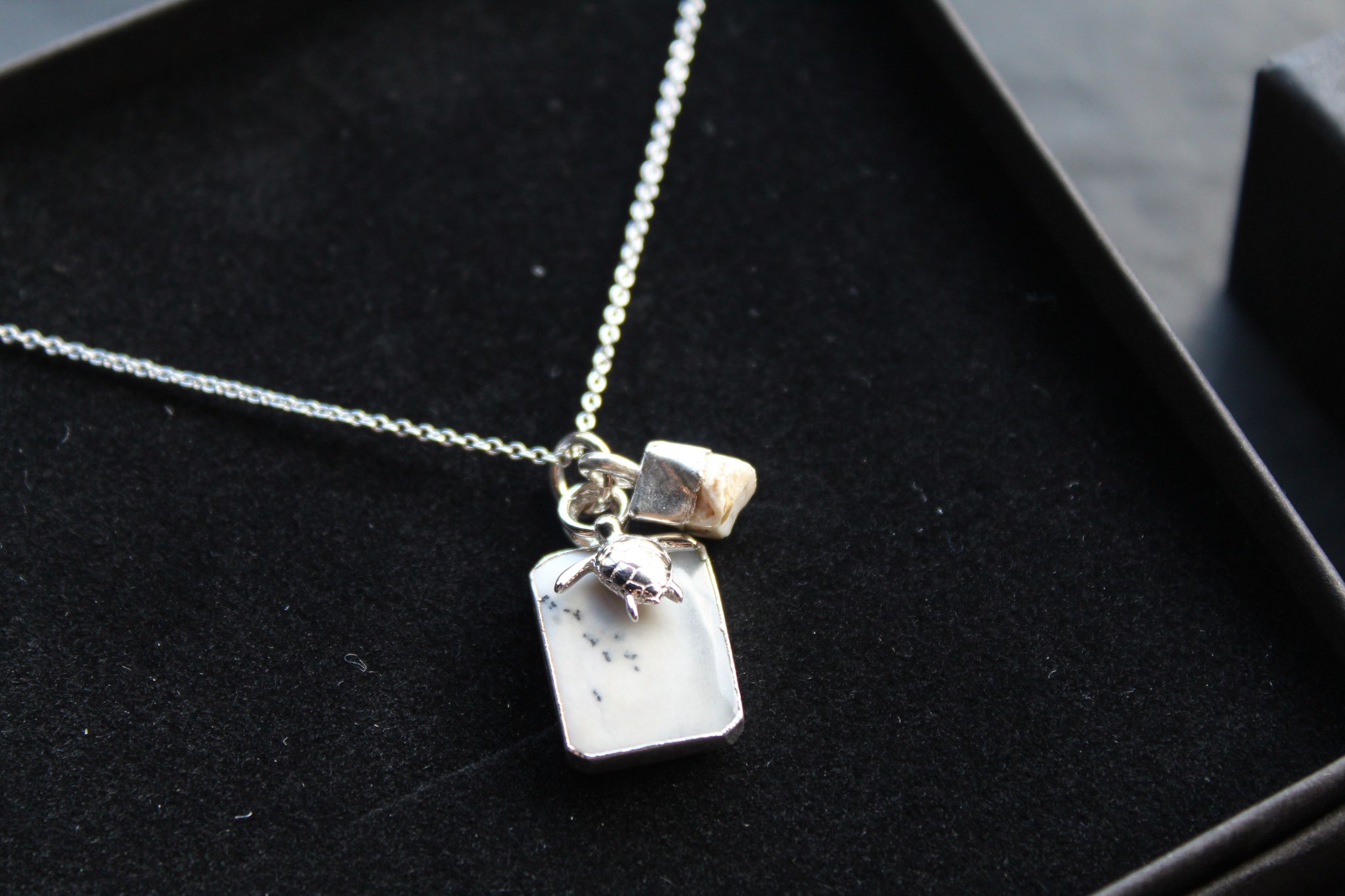 A stunning sterling silver electroplated Dendritic Agate rectangular slice pendant and White Howlite rough tumblestone, teamed with a beautiful sterling silver charm.