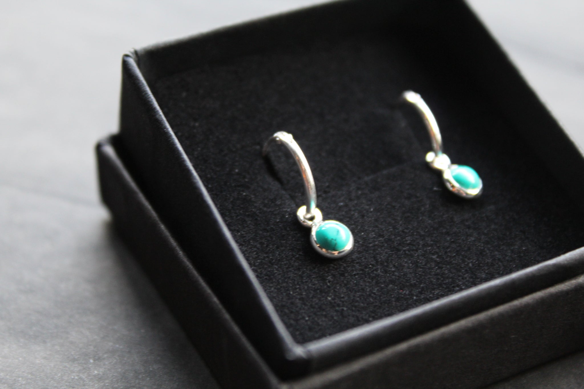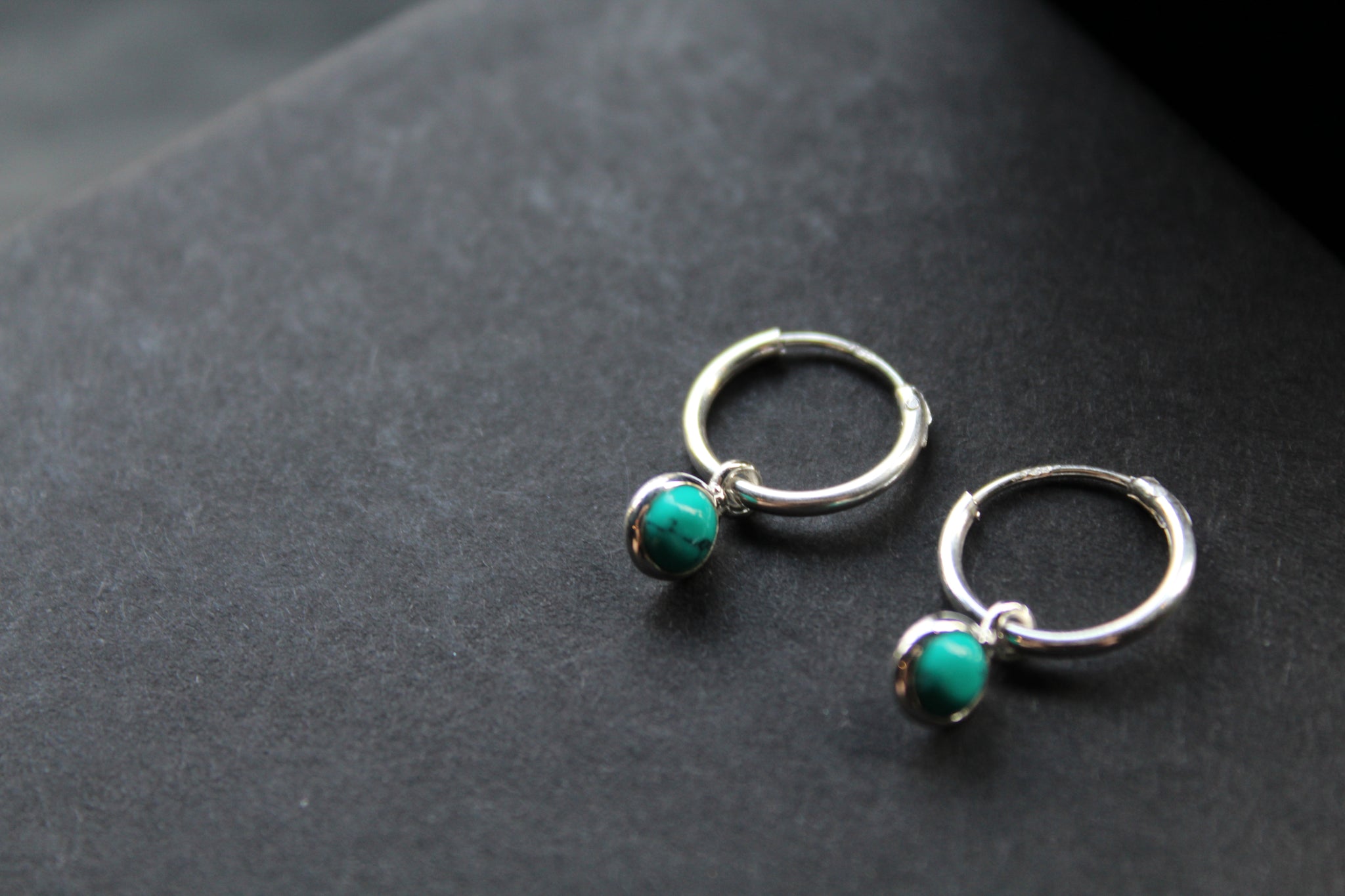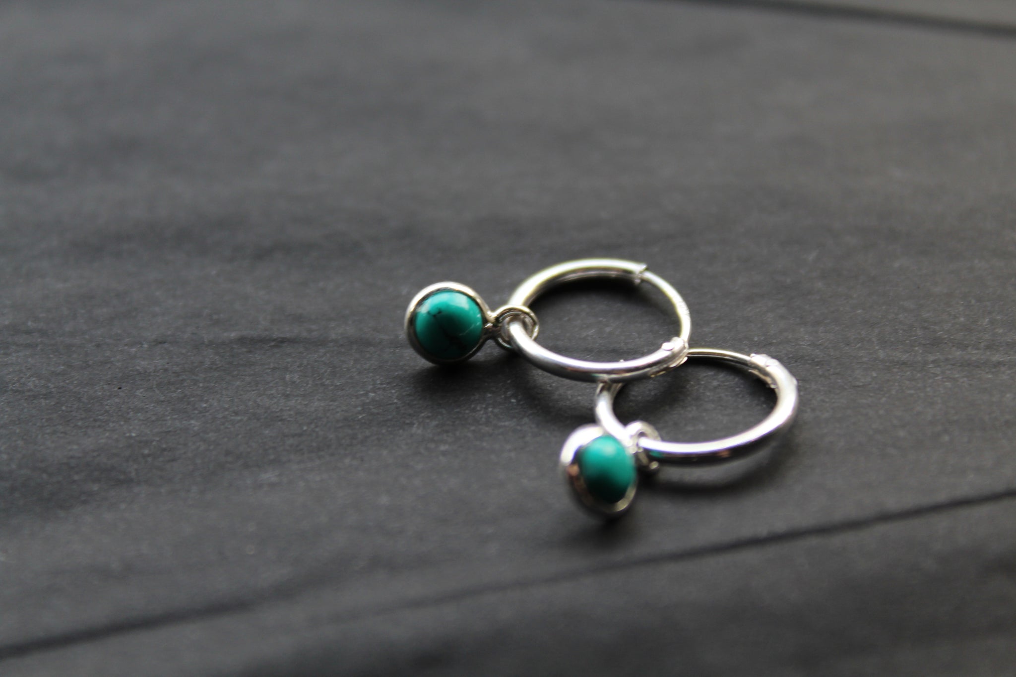 Simple silver sleeper earrings with small turquoise charm