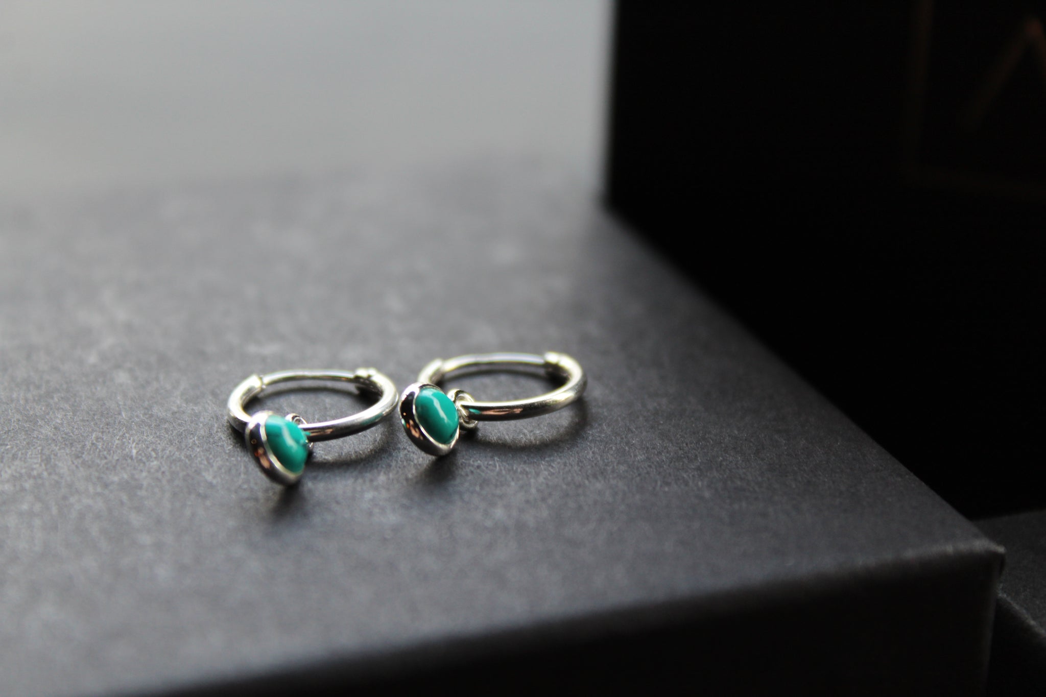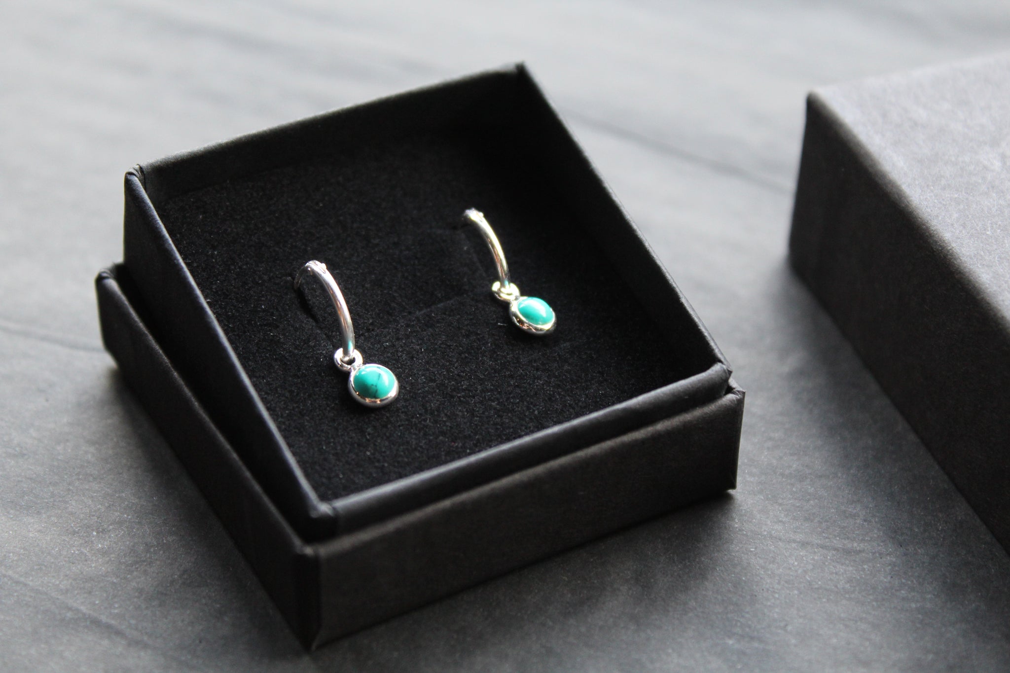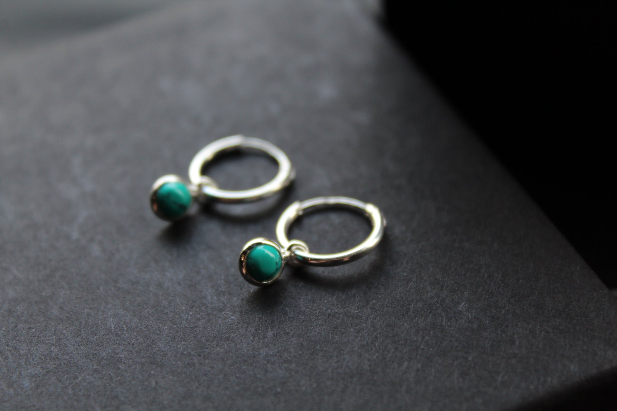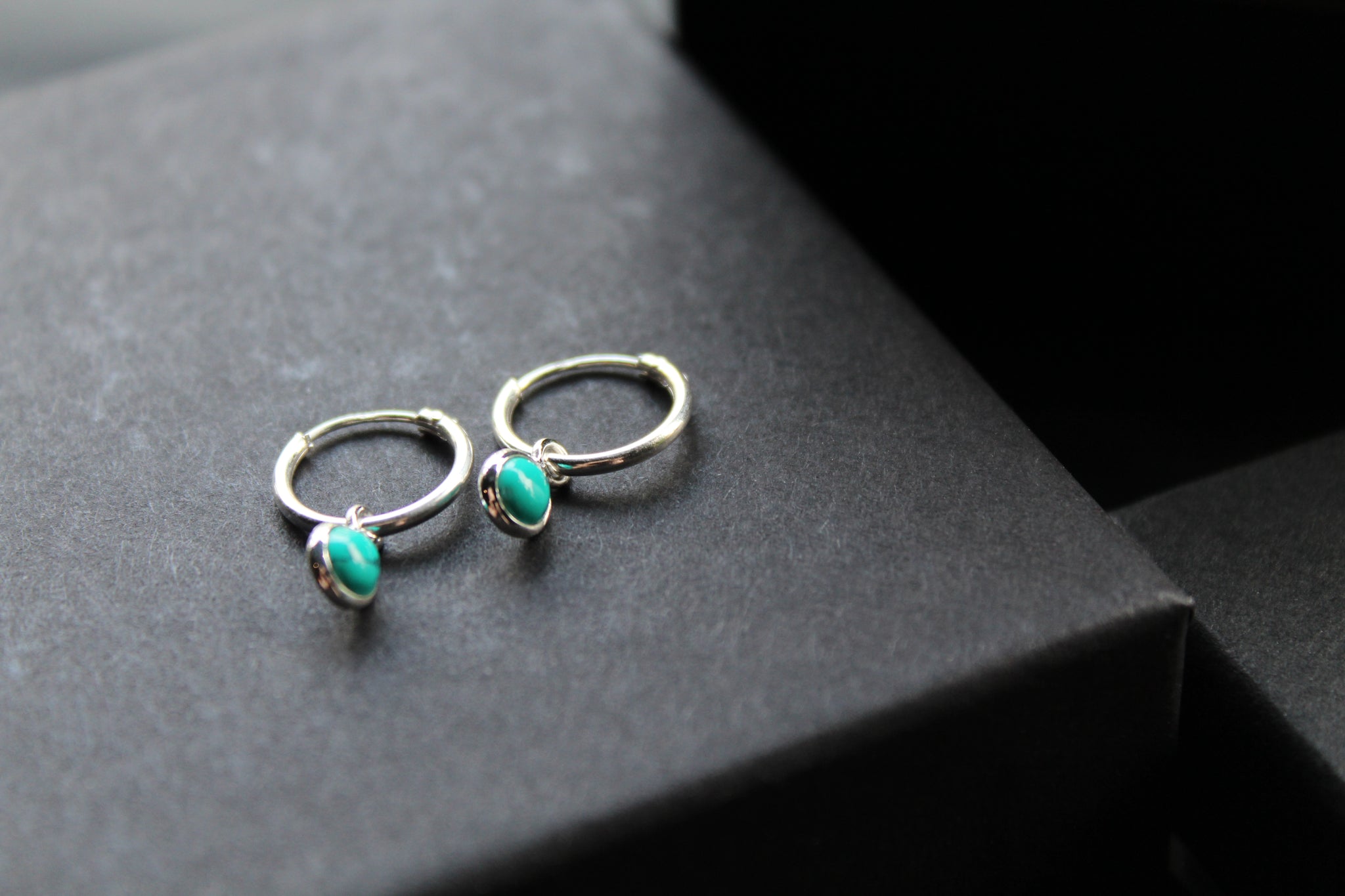 Simple silver sleeper earrings with small turquoise charm