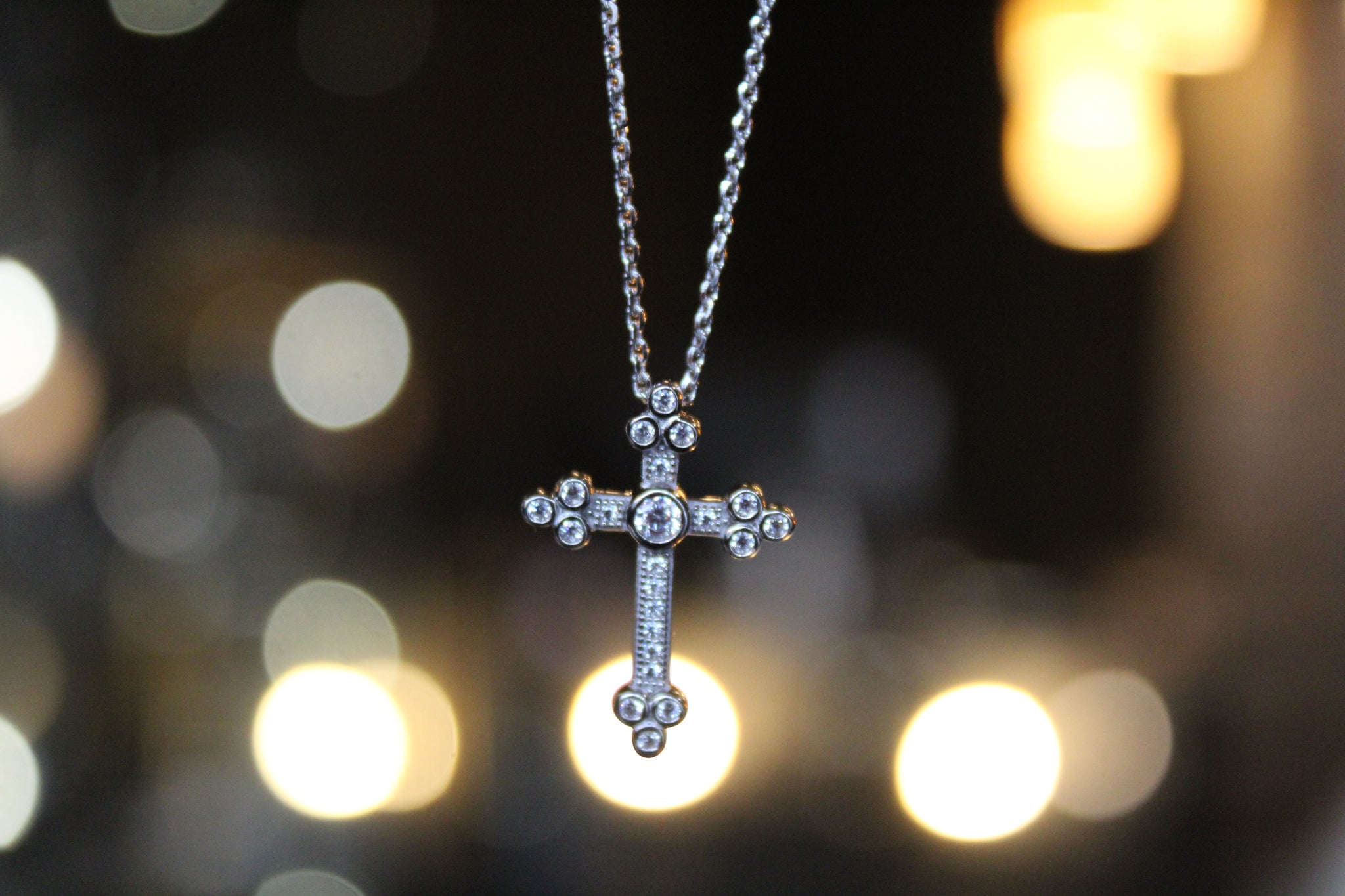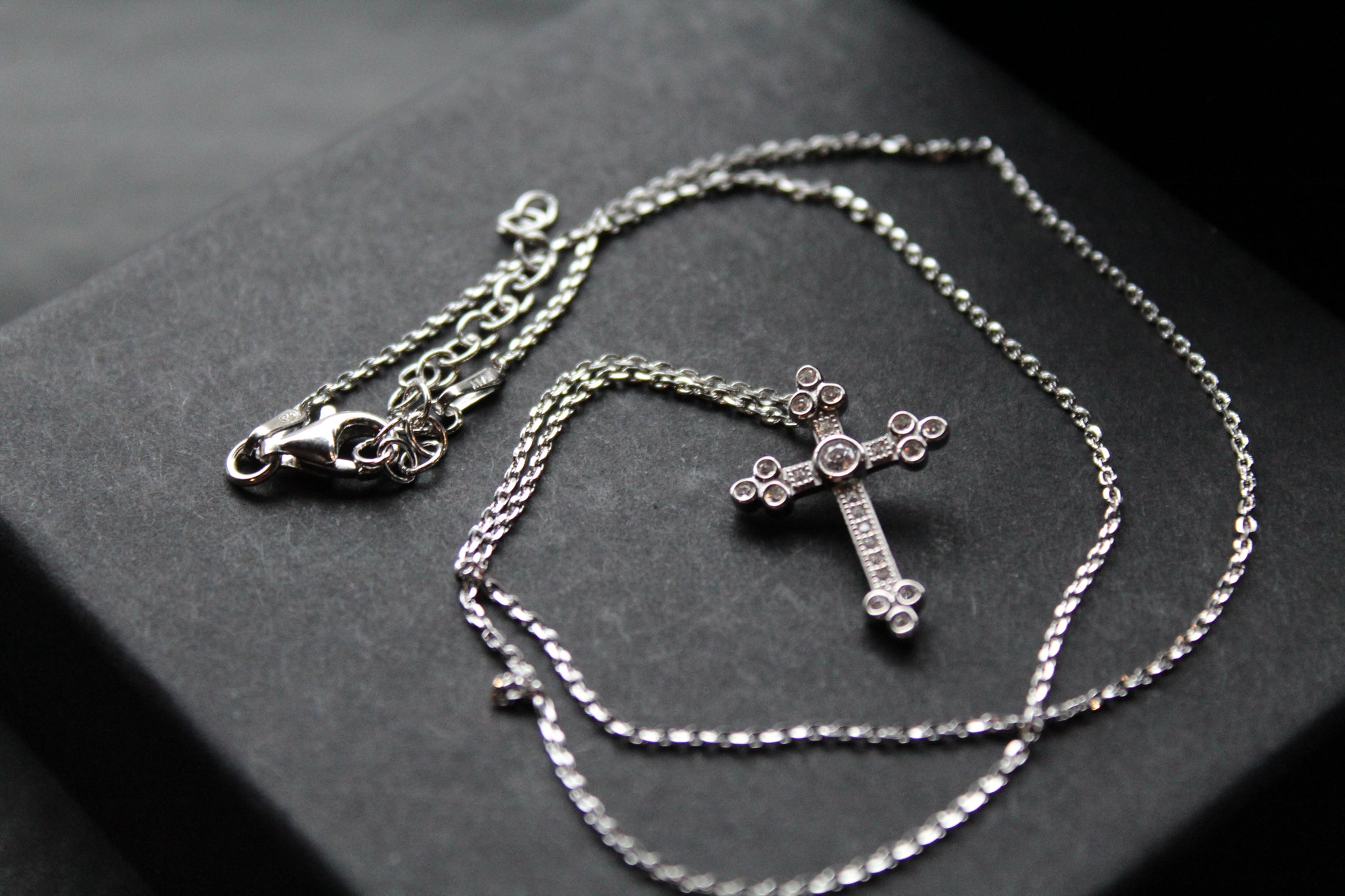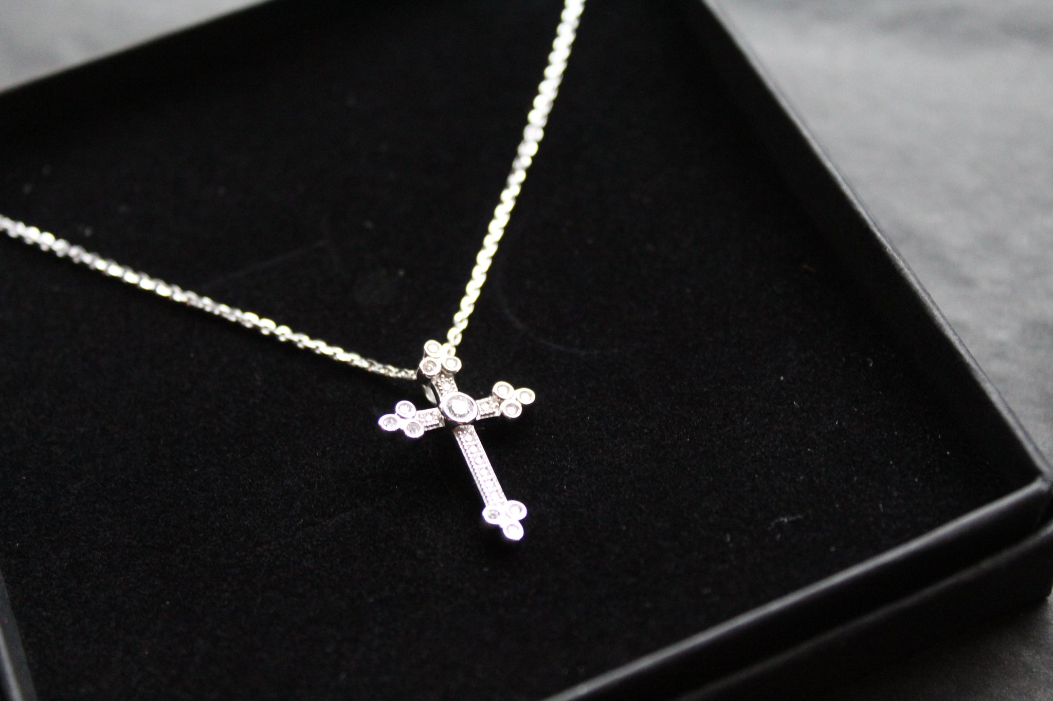 With a detailed cathedral cross design, it is micro-set with sparkling AAA* cubic zirconia stones and set on a 16-18" gold plated chain.